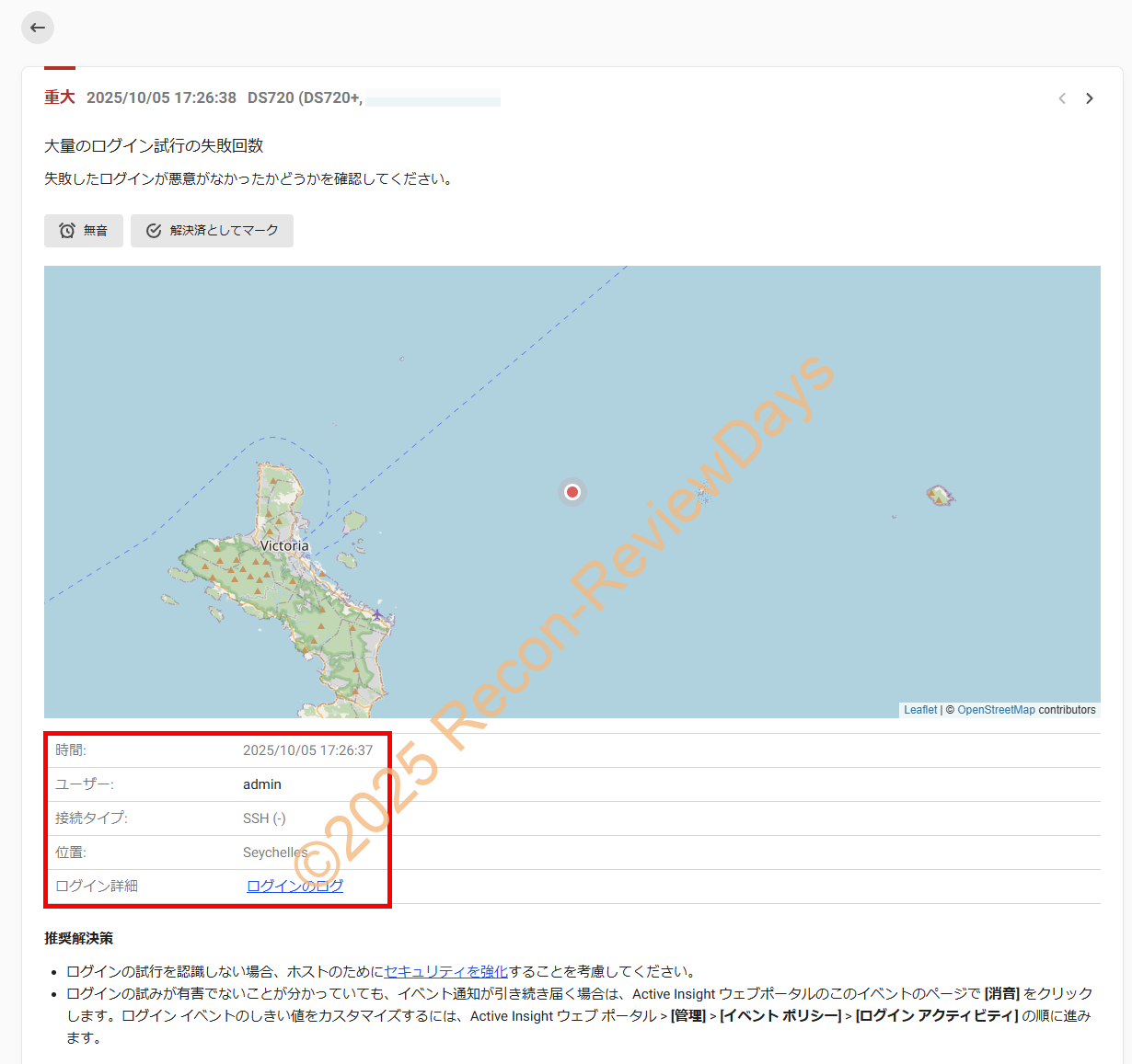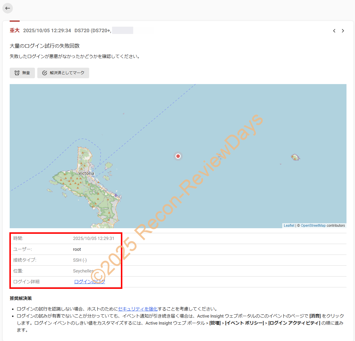 Synologyが提供している「Active Insight」経由でSSHを使ったログイン攻撃が総当たりで行われており、「mysql」や「admin」と言った標準で使用されているユーザーIDを使ってログインの試行錯誤が機械的に行われています。