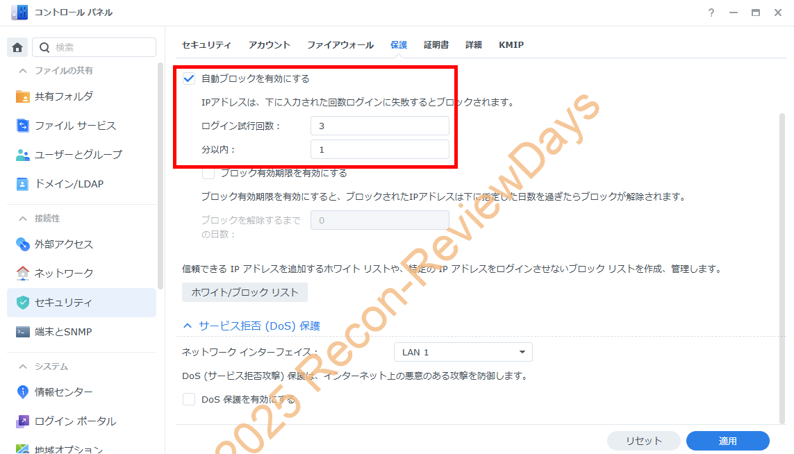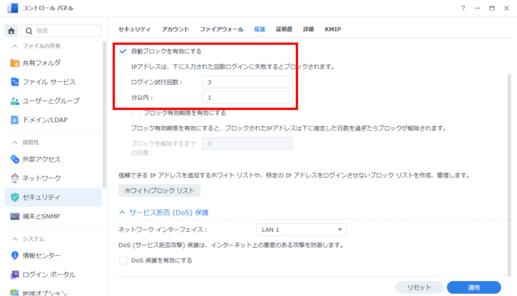 複数回のログイン失敗時の接続拒否設定は必須の設定かと思われるので、Synology製のNASを使用されている方は必ず設定を行いましょう。