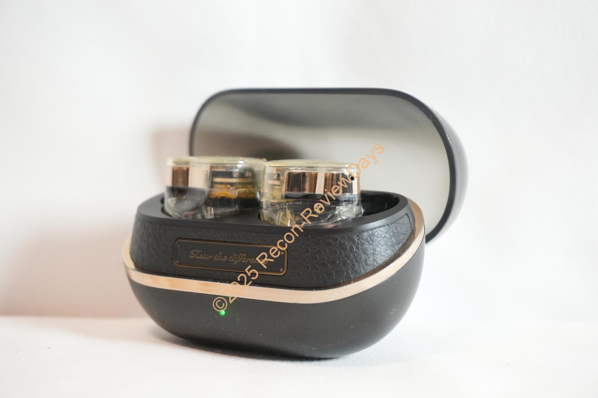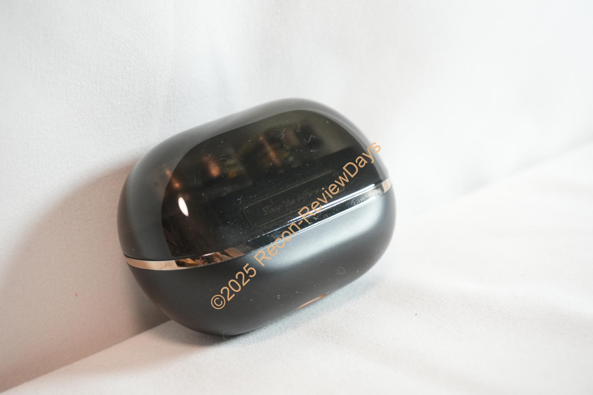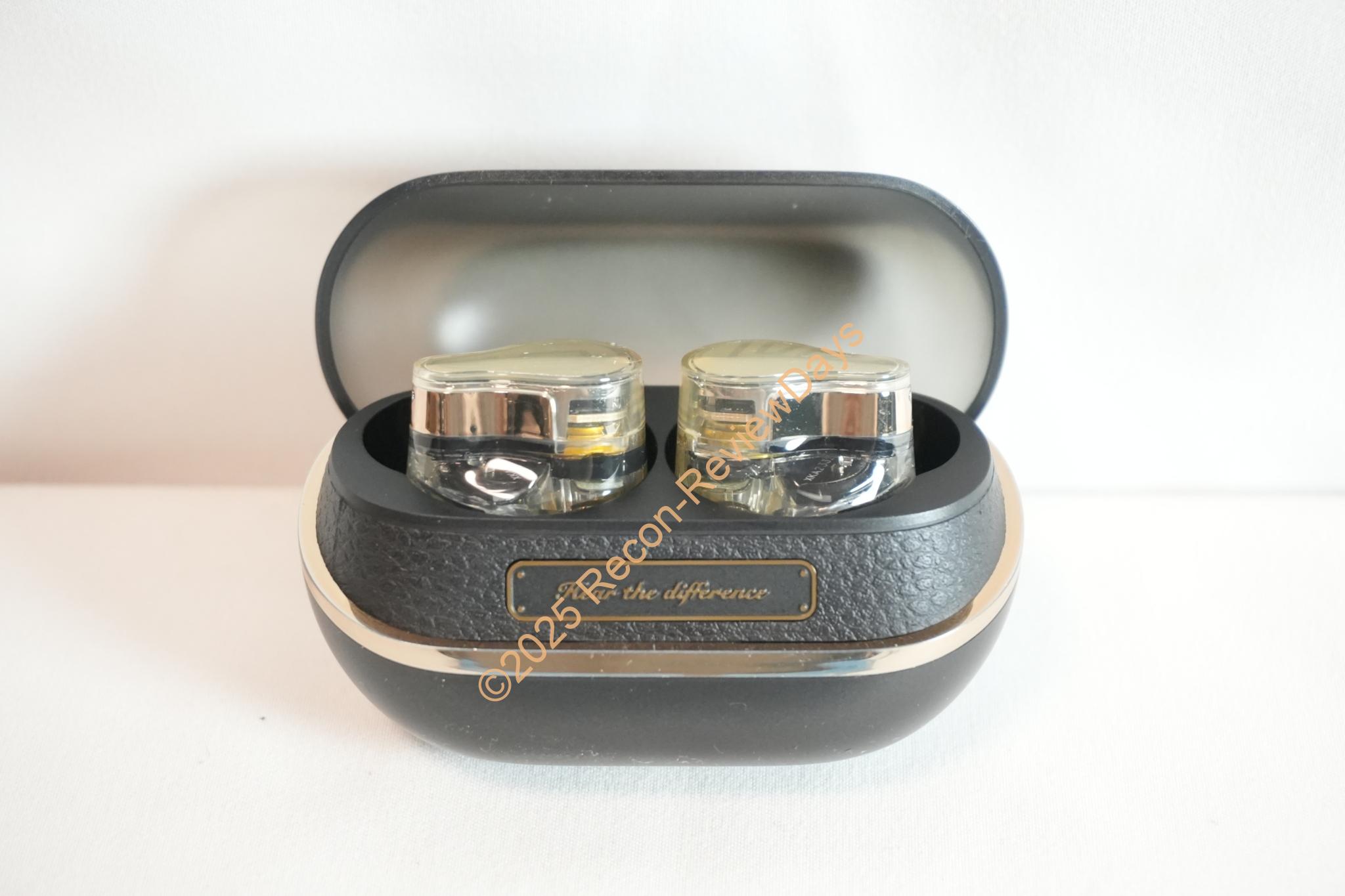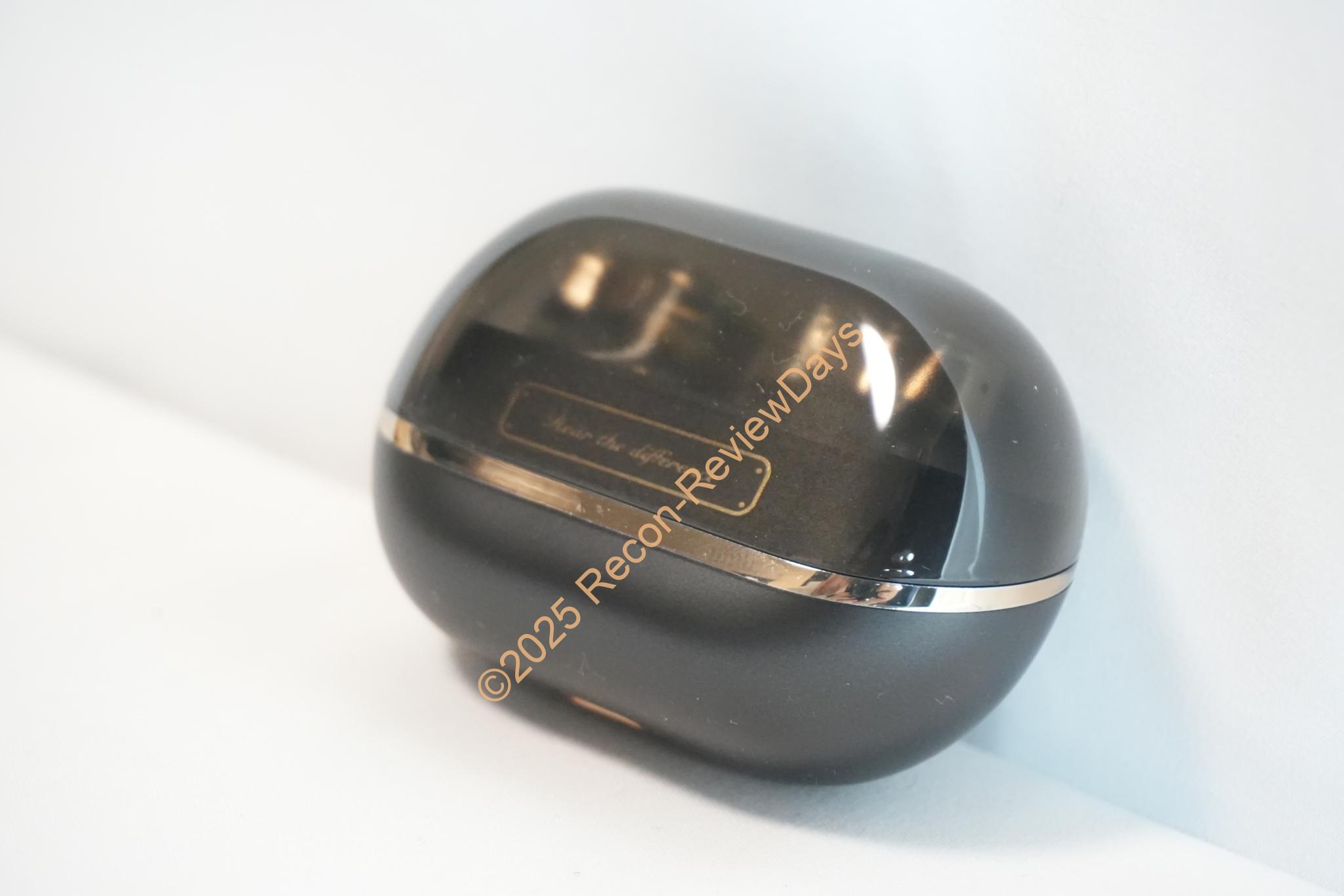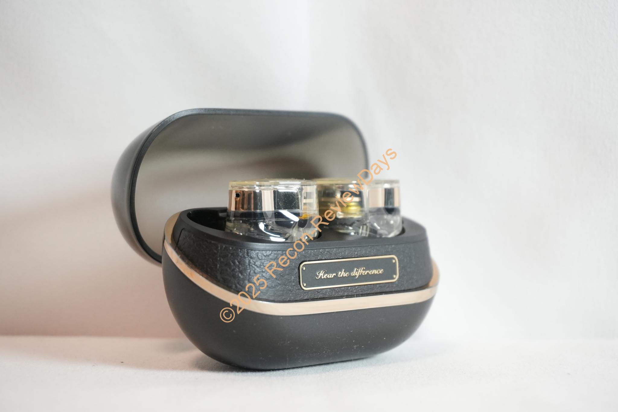 ゴールドに加飾されたケース横のラインや、レザー調シール、クリア感あるイヤホン本体で高級感の演出が凄い。