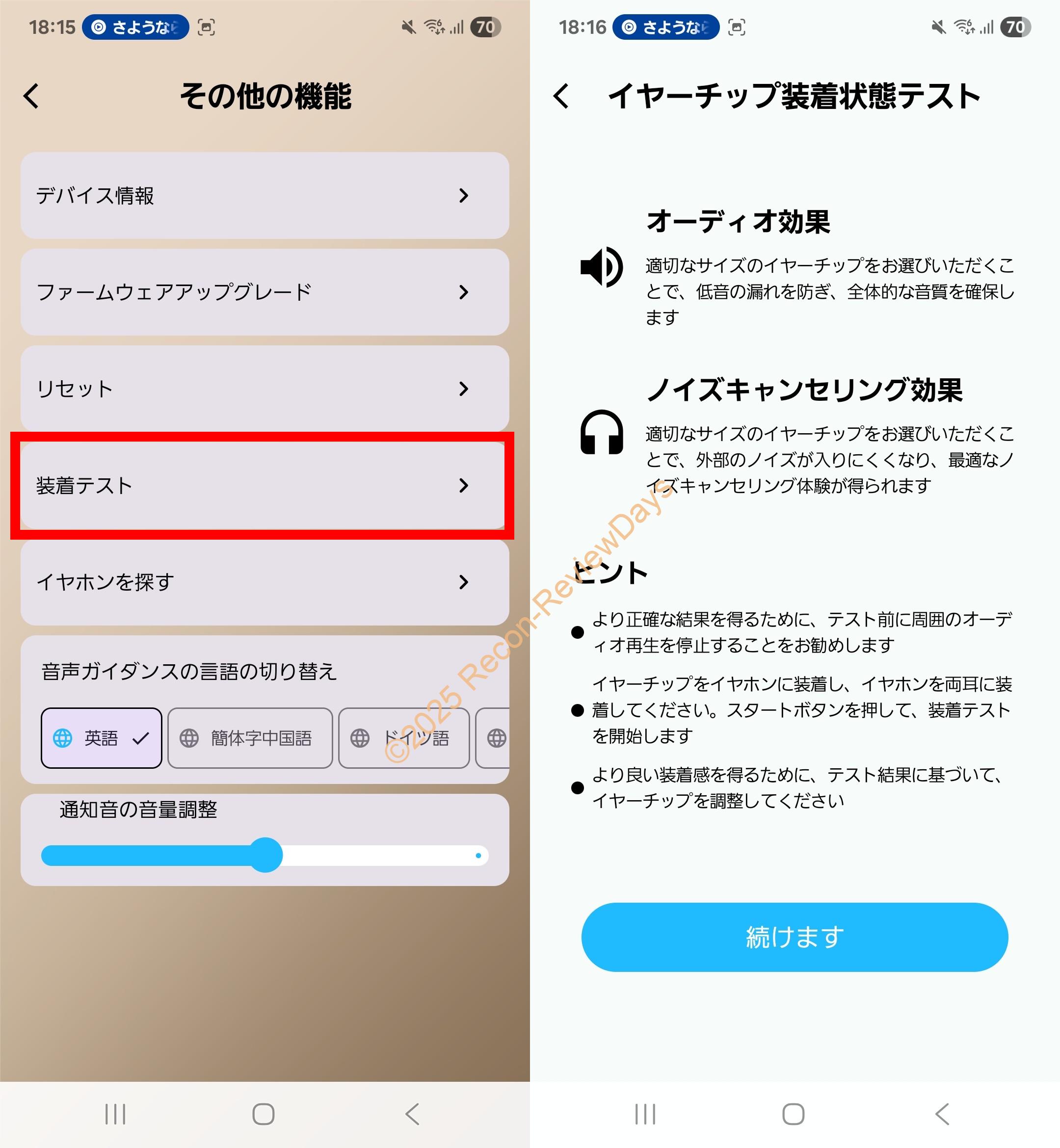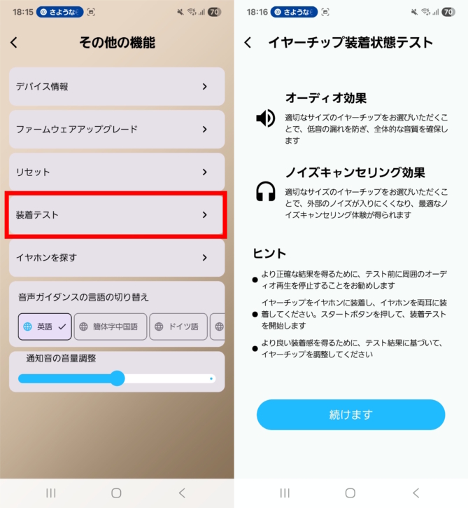 アプリ「PeatsAudio」上から「その他の機能 → 装着テスト → イヤーチップ装着状態テスト」を実行が可能で、ノイズキャンセリングを含めたテストが可能。