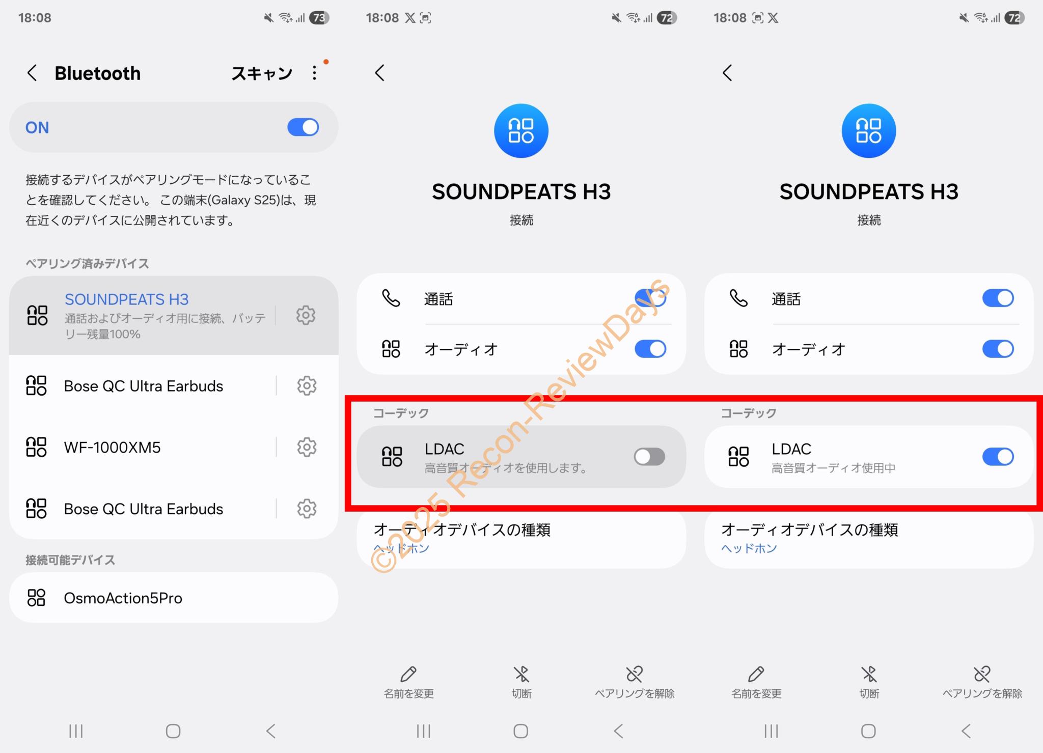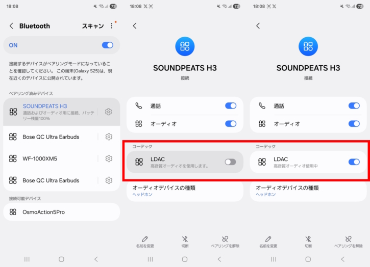AndroidスマートフォンでLDACを使用して「H3」と接続する場合、Bluetoothの設定から「LDACを有効化」しなければいけない事が多いため注意として記載しておきます。