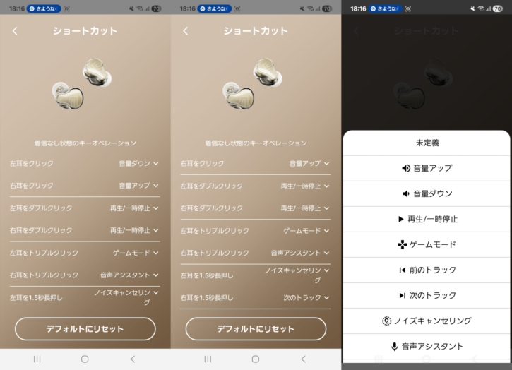 イヤホンの側面にあるタッチセンサーで「音量アップ、音量ダウン、再生/一時停止、ゲームモード、曲戻し、曲送り、ノイズキャンセリング、音声アシスタント」の操作が可能となっており、アプリ「PeatsAudio」でショートカット機能の割り当ての変更が可能です。