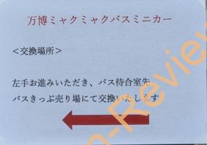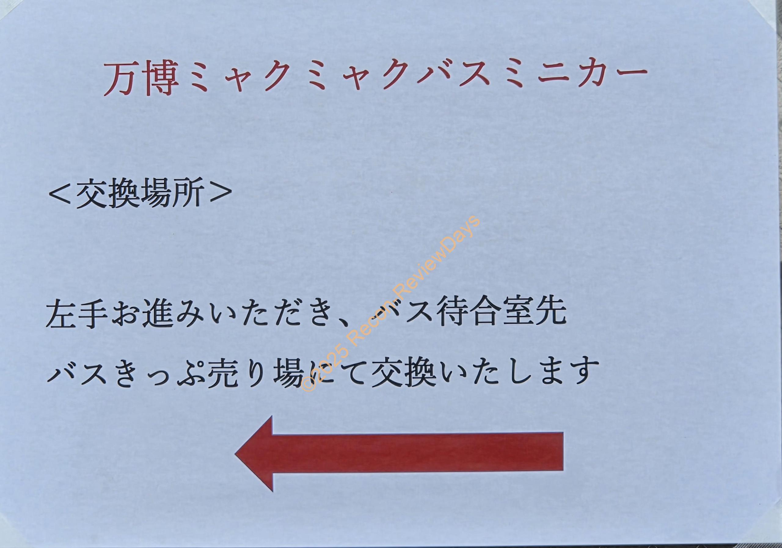 表に「万博ミャクミャクバスミニカー 交換場所 左手お進みいただき、バス待合室先 バスきっぷ売り場にて交換いたします」と記載がありました。