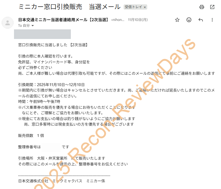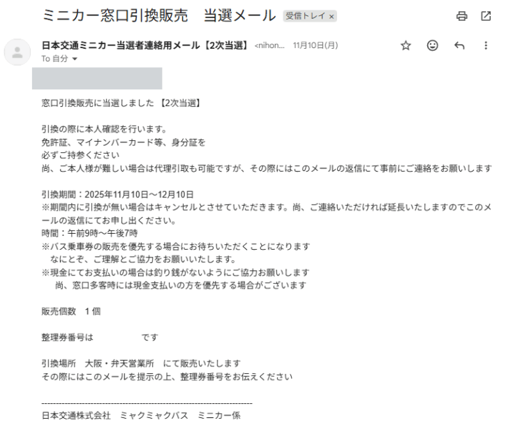 2025年11月10日頃に2次抽選分の当選メールが送られており、運良く筆者が当選。