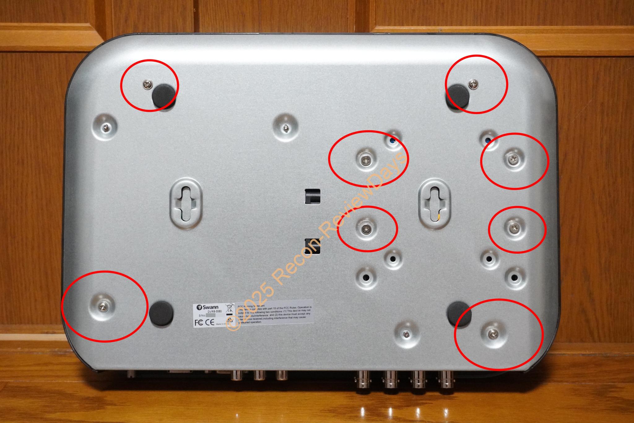 レコーダー裏にある赤丸を付けたネジ類を取り外し、上蓋をスライドして取り外します。