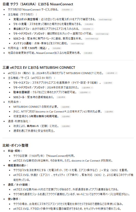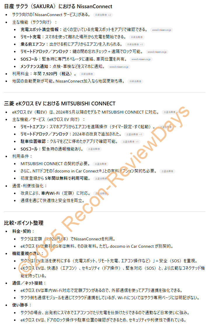 念のため「ニッサンコネクト(NissanConnect)」と「MITSUBISHI CONNECT」を「ChatGPT」で比較させてみましたが、内容的に「MITSUBISHI CONNECT」は「自動マップアップデート」が別にサービス料金(年6,600円)必要との事で、「ニッサンコネクト(NissanConnect)」の方がデフォルトで地図更新(年3回)が付属するため、お得感は有ります。