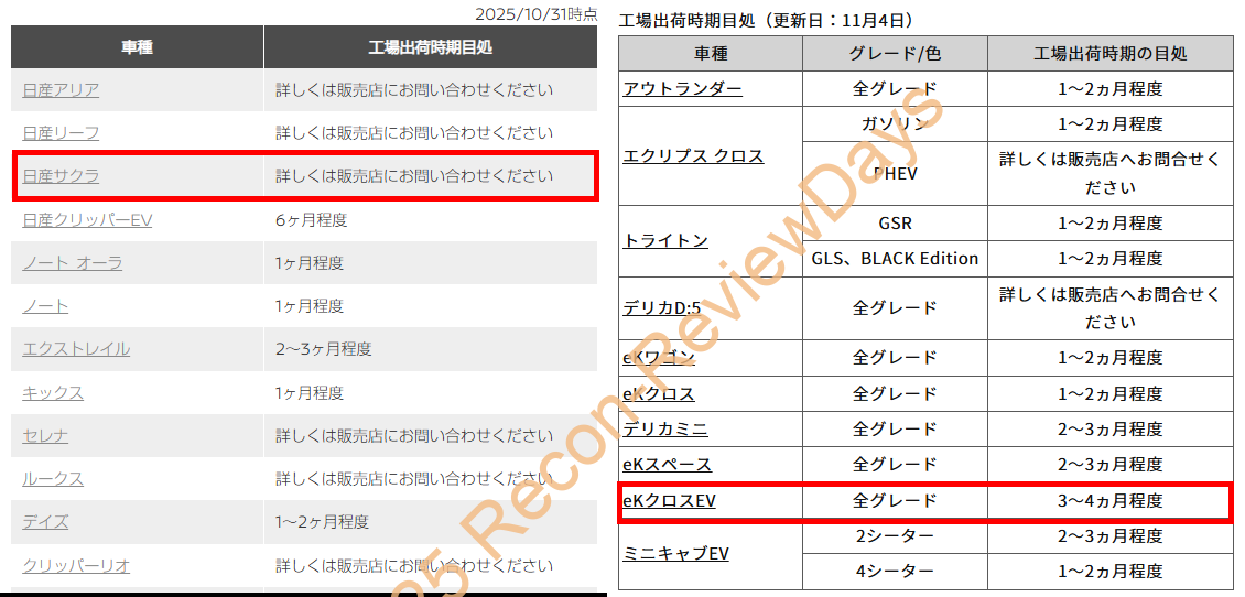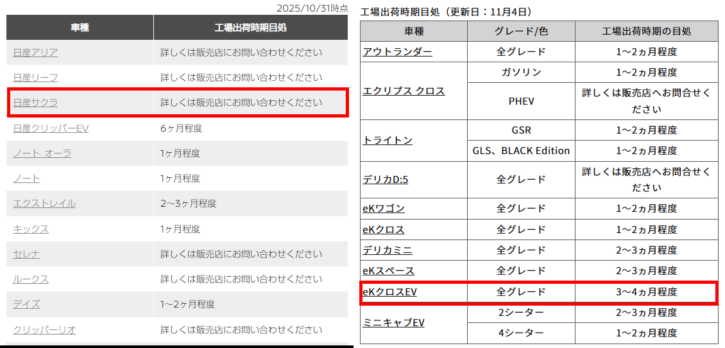 因みに2025年11月時点で日産「サクラ」は「詳しくは販売店にお問い合わせください」で注文不可、三菱「eKクロスEV」は「3~4ヵ月程度」と比較的納期は長めになっている状況で、今すぐ欲しいという需要には答えられなさそう。