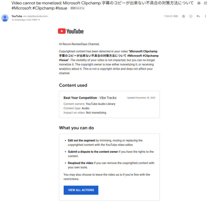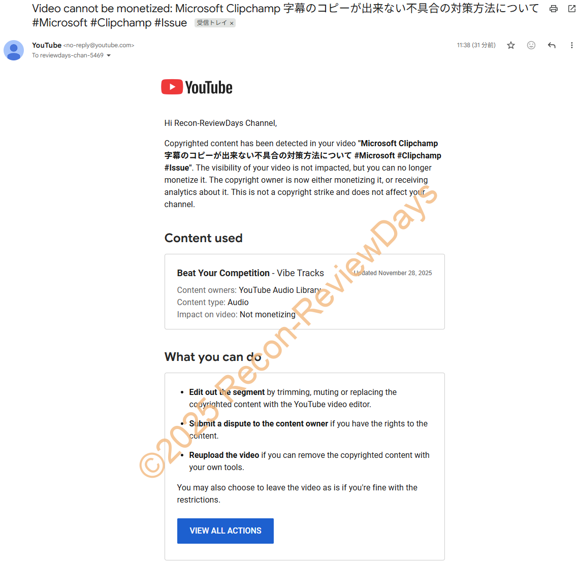 メール本文: Hi Recon-ReviewDays Channel,Copyrighted content has been detected in your video “Microsoft Clipchamp 字幕のコピーが出来ない不具合の対策方法について #Microsoft #Clipchamp #Issue”. The visibility of your video is not impacted, but you can no longer monetize it. The copyright owner is now either monetizing it, or receiving analytics about it. This is not a copyright strike and does not affect your channel.
