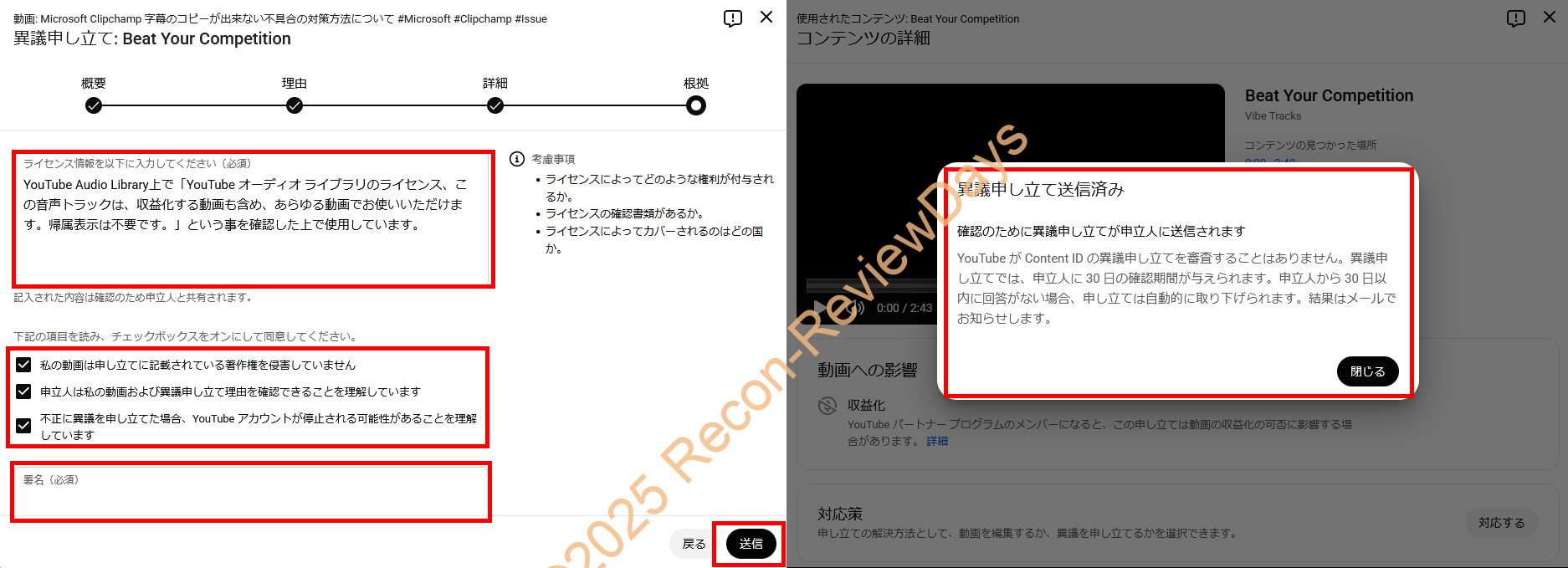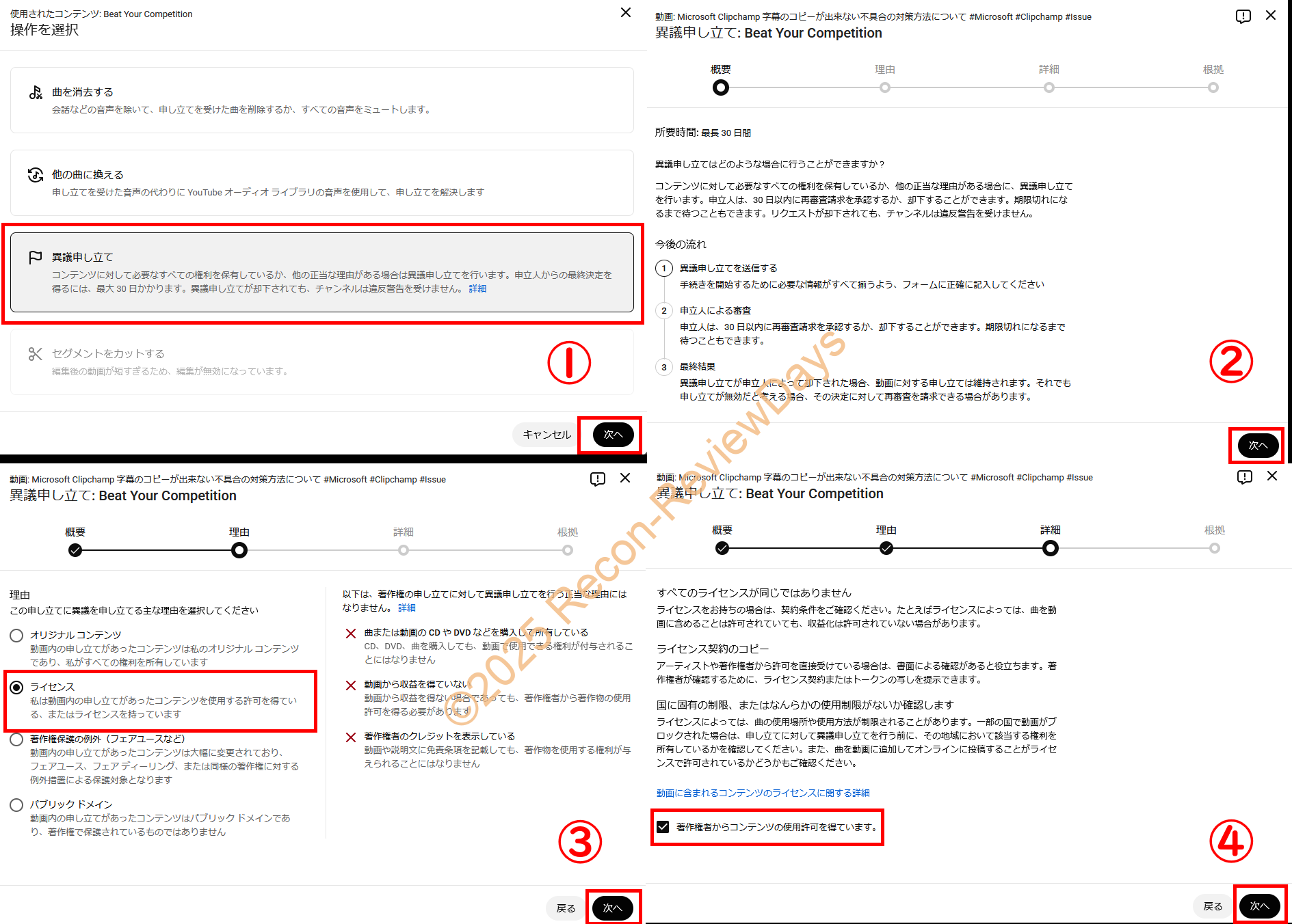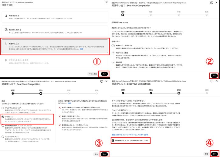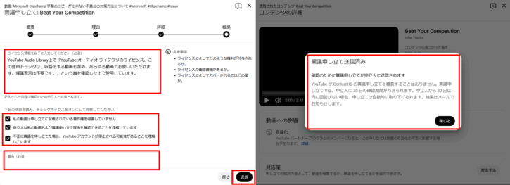 上記画像の通り「異議申し立て → ライセンスにチェック → ”著作権者からコンテンツの使用許可を得ています”にチェック」を入れましょう。