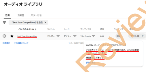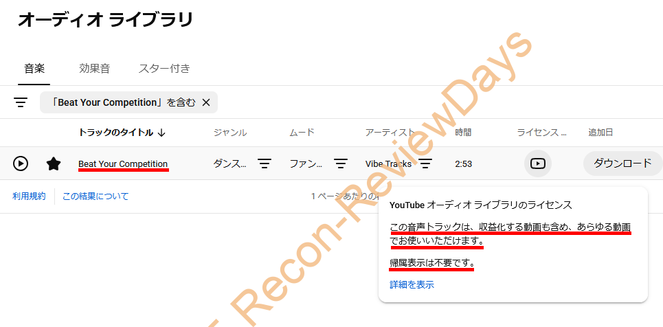 「YouTube Audio Library」から「Beat Your Competition」を検索し、ライセンスの状態を再度確認してみましたが「この音声トラックは、収益化する動画も含め、あらゆる動画でお使いいただけます。帰属表示は不要です。」と表示されており、当方のBGMの利用方法に問題は無いことを確認。
