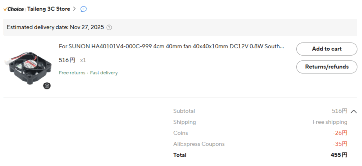 注意点としては「AliExpress」上で「Choice(合計1,500円以上で送料無料、それ以下は送料+300円必要)」の製品を選んでいますが、ファン1個じゃ送料無料にすることが出来ない(1,500円以上にならない)ので、筆者の場合は別の製品と抱き合わせ購入をしています。