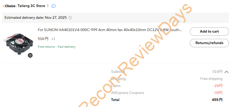 「AliExpress」でファンを購入。お値段コインやクーポンなどの使用で「455円」。