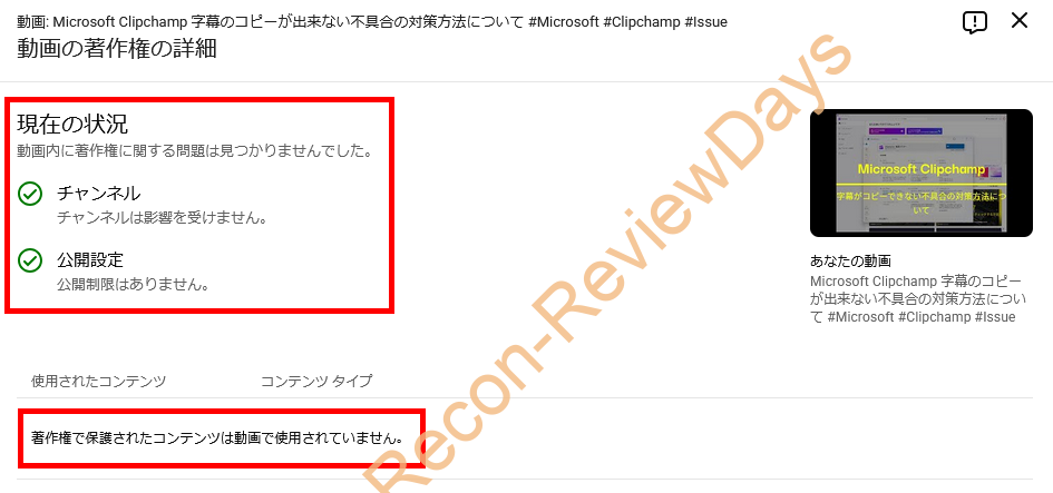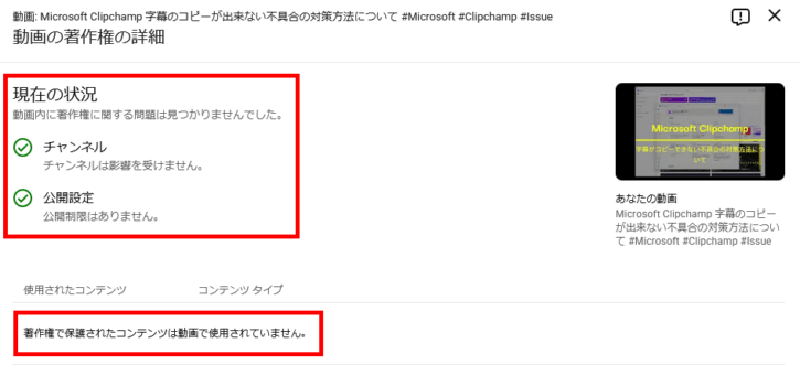 YouTube Studio上でも「動画内に著作権に関する問題は見つかりませんでした」表記に