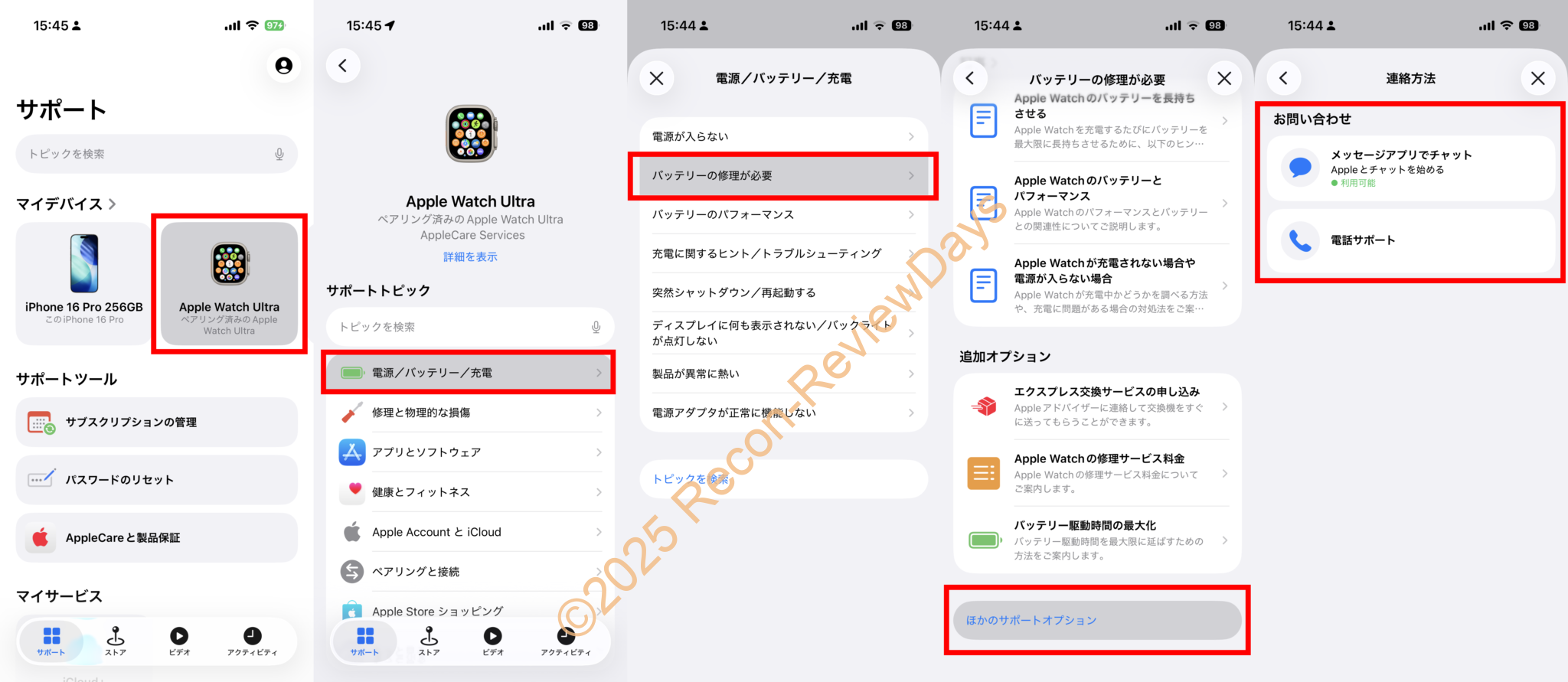 Appleに直接SMS経由のチャットサポート、もしくは電話サポートで「配送修理」を依頼する場合は「サポートアプリ」から「マイデバイス → Apple Watchを選択 →電源/バッテリー/充電 → バッテリーの修理が必要 → 下側にある他のサポートオプション → メッセージアプリでチャット or 電話サポート」から問い合わせを行いました。