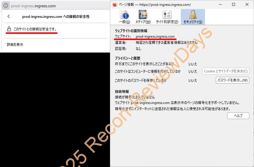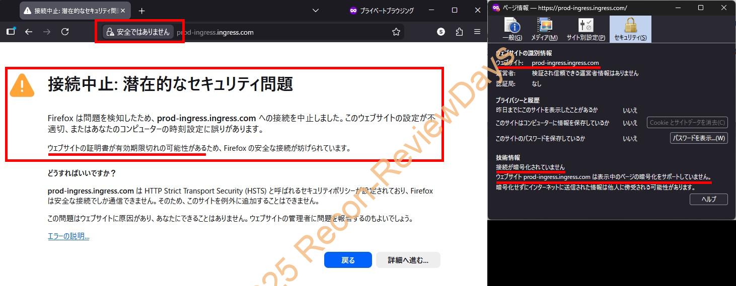 原因は「ログインサーバーのドメイン”prod-ingress.ingress.com”のSSL有効期限切れ」で、証明書の有効期限が「2025年9月29日(月) 15時52分53秒~2025年12月28日(日) 16時46分47秒迄」となっており、現時点で証明書の更新が行われていないためHTTPS接続が行えずエラーが発生しているものかと思われます。
