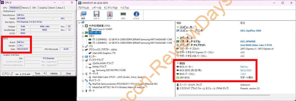 「CPU-Z」と「HWINFO64」で確認したところ「V1.34.1(2025.08.22)」になっている事が確認出来ました。
