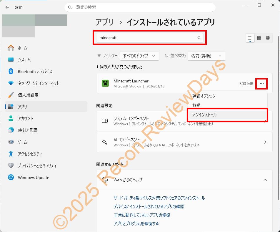 Windows 11の「設定 → アプリ → インストールされているアプリ → Minecraft → … → アンインストール」で一旦PCからMinecraftを削除しましょう。