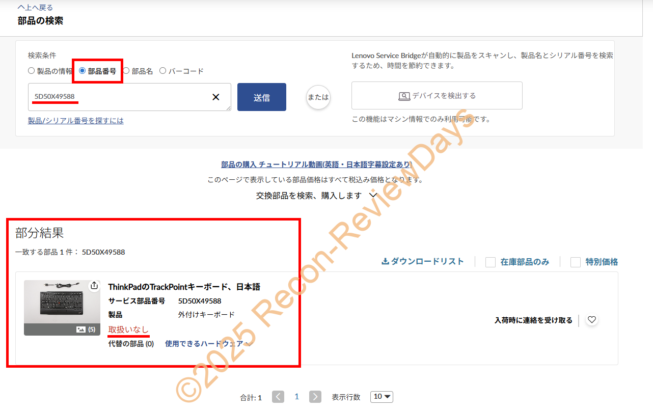 Lenovoの純正部品を検索できる「純正サービス部品」で「部品番号: 5D50X49588」を調べたところ、「取扱いなし」と表示され、「代替部品(0)」でした。