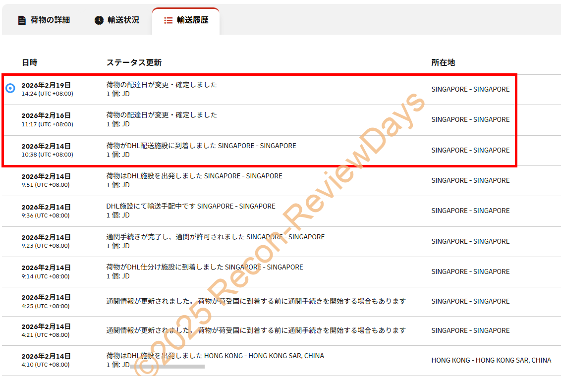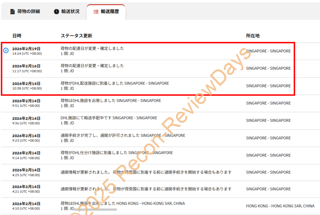 春節の影響でAMDのRMA先であるシンガポール工場への配達が後ろ倒しになっており、2026年2月16日に配達予定だったものが2月19日現在でも「荷物の配達日が変更・確定しました」と記載されており、配送が後ろ倒しにされています。