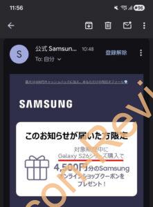 既にGalaxy系の端末を所持している方に「事前登録+S26シリーズの購入」で「オンラインショップクーポンが4,500円分貰える」という案内がありましたが、「購入前に貰えるクーポンではなく、端末購入後に後日付与されるモノ」だったようです。