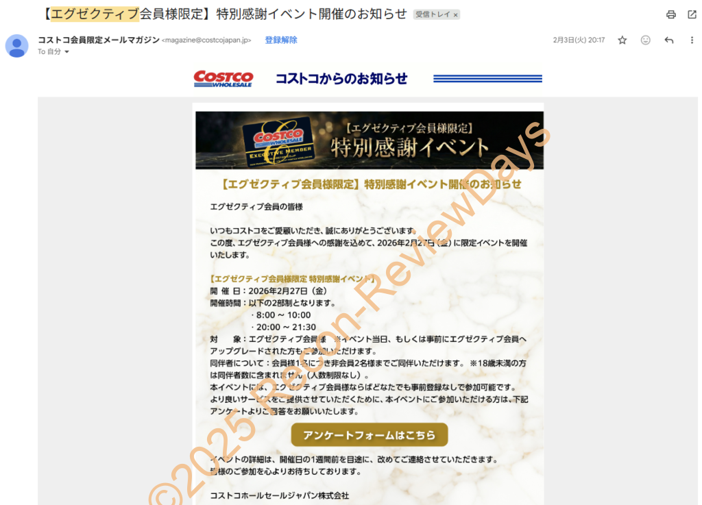 2026年2月17日 20時頃に最終のイベントの案内メールが来ており、最終的な条件は「エグゼクティブ会員であること」、「イベント参加フォーム記入の倉庫店に行くこと」、「会員本人を含めて最大3名迄の参加(通常の同伴ポリシー※18歳以上2名迄が適用)」という内容が記載されていました。
