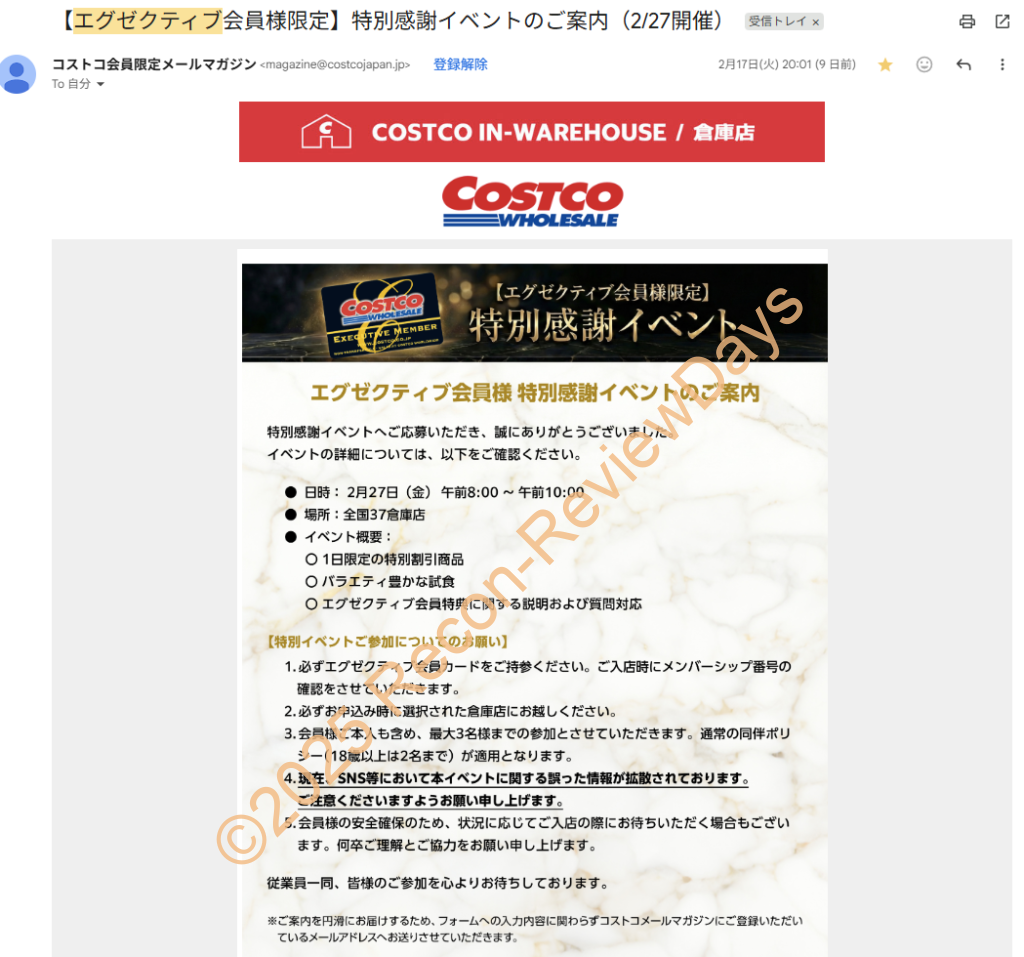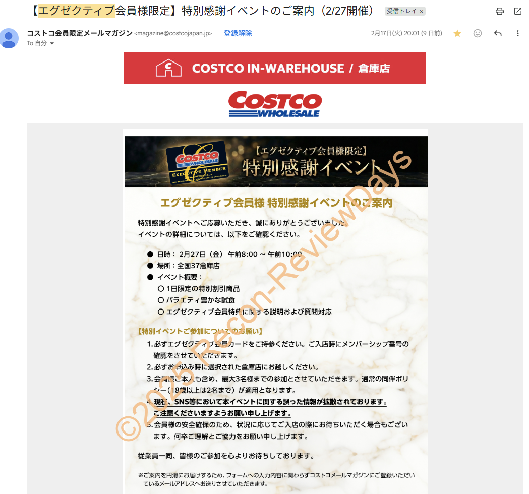 | 2026年2月17日 20時頃 | 「【エグゼクティブ会員様限定】特別感謝イベントのご案内(2/27開催)」というメールタイトルで内容が送られており、2026年2月27日(金) 午前8時~午前10時に全国37倉庫店でイベントの詳細を告知。 最終的な条件は「エグゼクティブ会員であること」、「イベント参加フォーム記入の倉庫店に行くこと」、「会員本人を含めて最大3名迄の参加(通常の同伴ポリシー※18歳以上2名迄が適用)」といった内容。 |