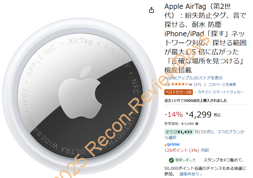 「AirTag 第2世代」2026年1月26日に発売されたばかりの新型で、まだ1か月半前後しか経過していないにも関わらず「14%引き、4,299円」という特価で販売されています。