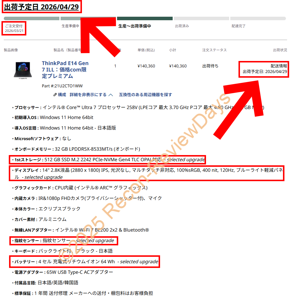 2026年3月21日に購入した「ThinkPad E14 Gen 7 ILL 価格.com限定 プレミアムモデル(Core Ultra 7 258V/32GB/1TB→512GB変更/14インチ2.8K液晶@120Hz/Win11 Home、21U2CTO1WW)」の納期がようやく表示されていました。