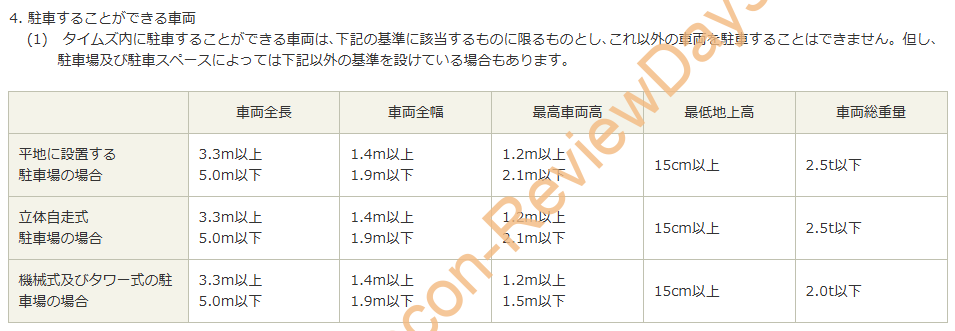 タイムズ約款: 全長: 約3.3~5.0m以下 × 全幅: 約1.4m以上~1.9m以下 × 車両高: 約1.2m以上~2.1m以下 × 最低地上高:約15cm以上 × 車体重量: 2.0トン~2.5トン以下