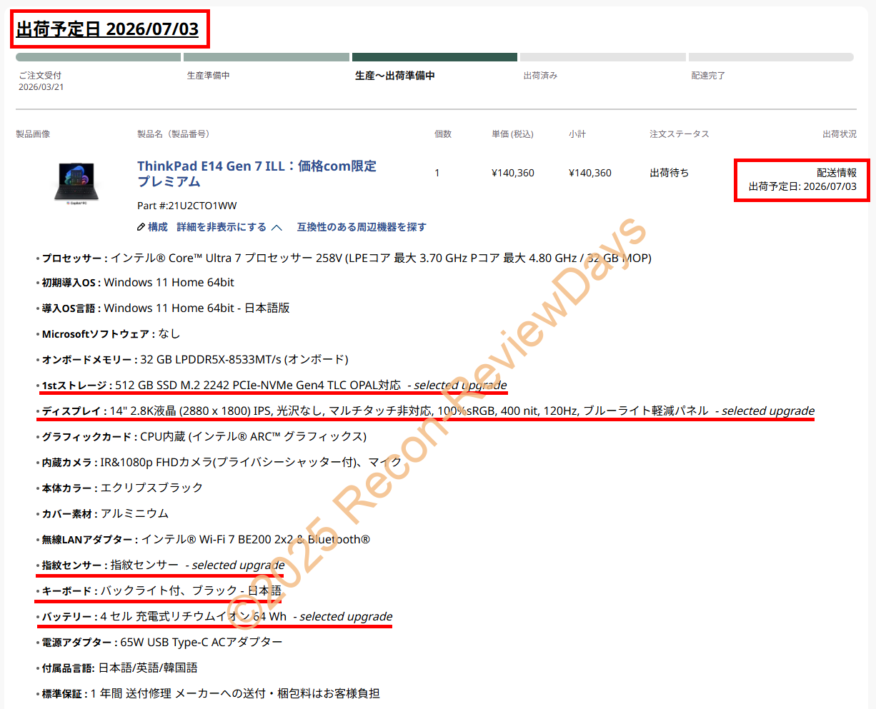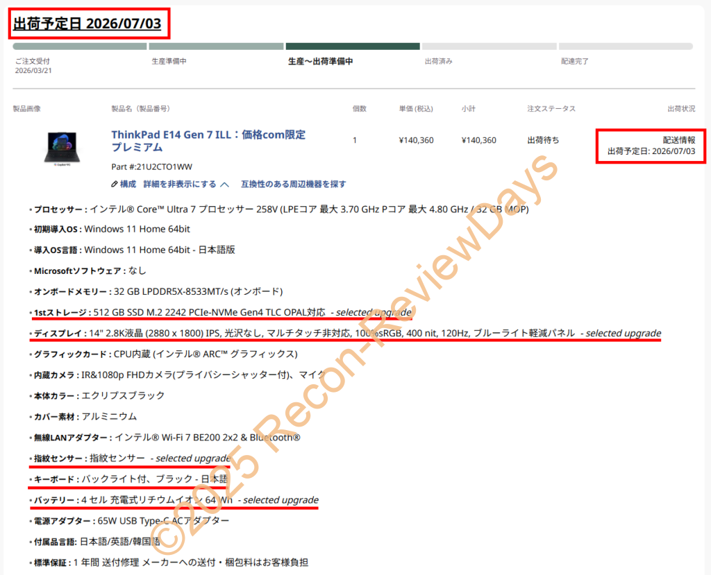 - Lenovo ThinkPad E14 Gen 7 ILLの納期が遅れて「2026年6月02日」にズレてしまった – Recon-ReviewDays