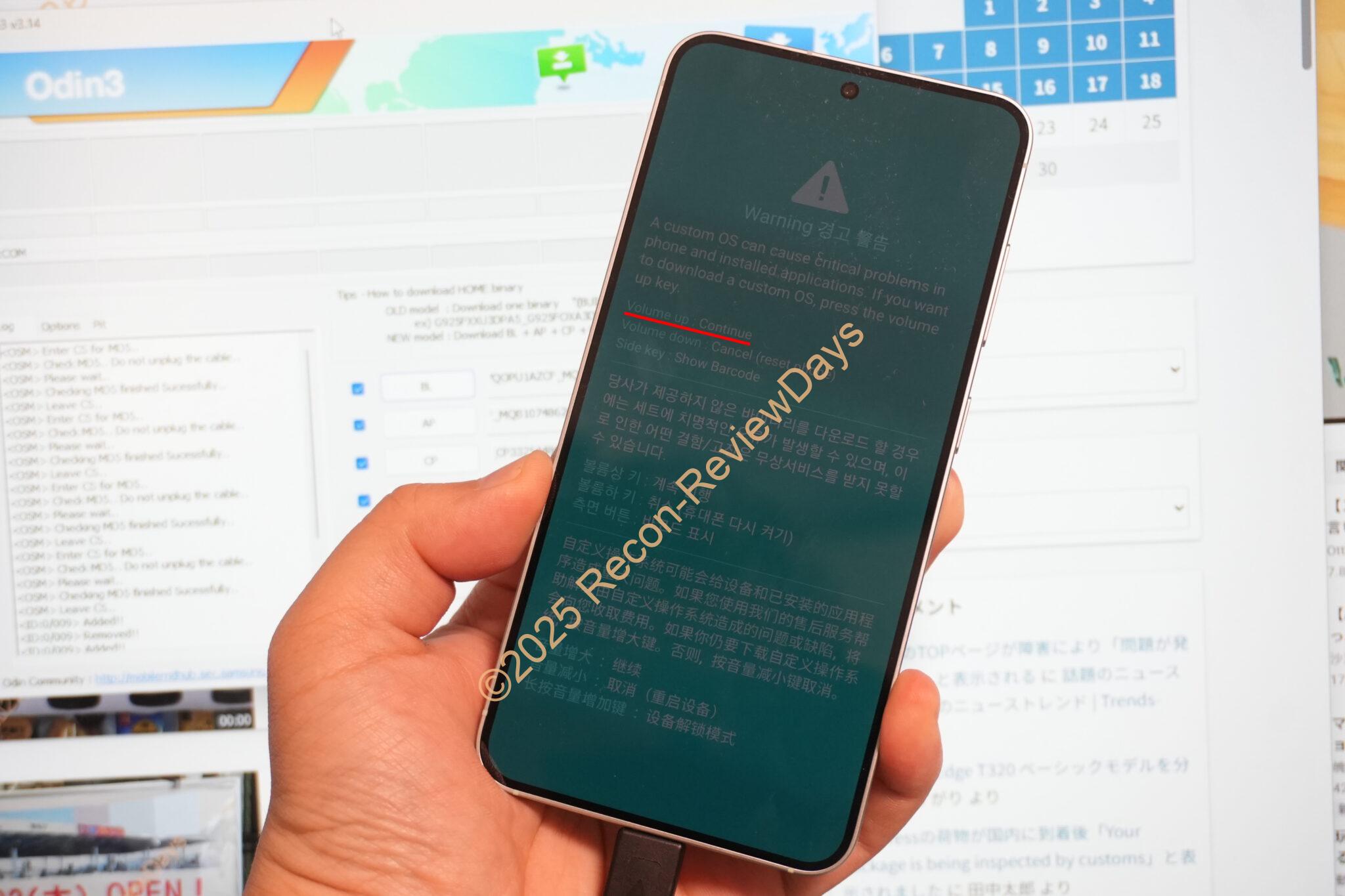 その後「音量上キー」を押すことでPC側のソフト「ODIN」からROMの書き込みの待機モードとなります。