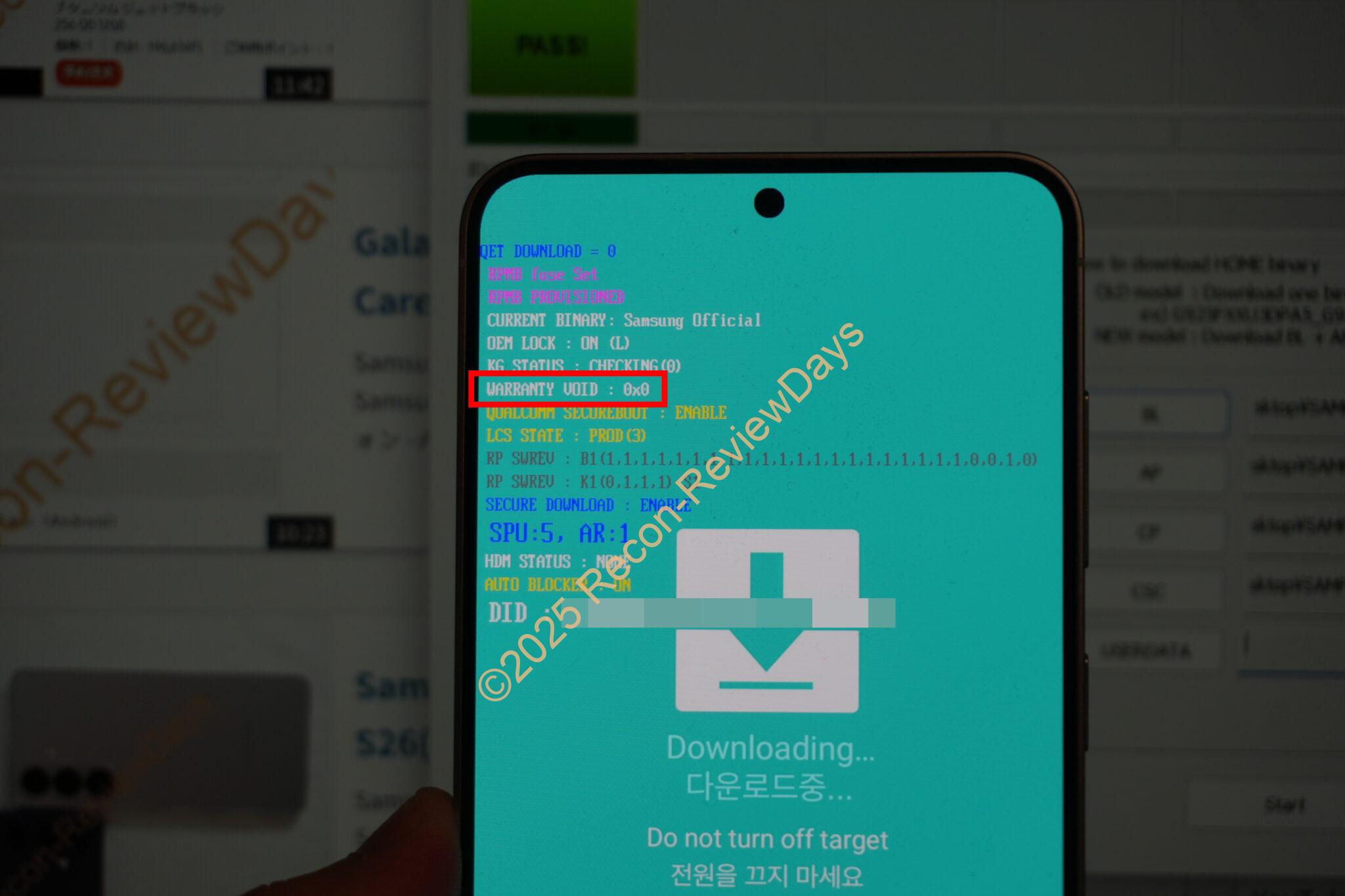 ROM焼き後、もう1度「音量下キー(押しっぱなし) + 電源ボタン(途中離す)」でODINモードに入って確認を行いましたが「WARRANTY VOID: 0x0」で保証は飛んでいませんでした。(非公式ROM系を焼いた場合は「WARRANTY VOID: 0x1(0xE03)」になる模様)
