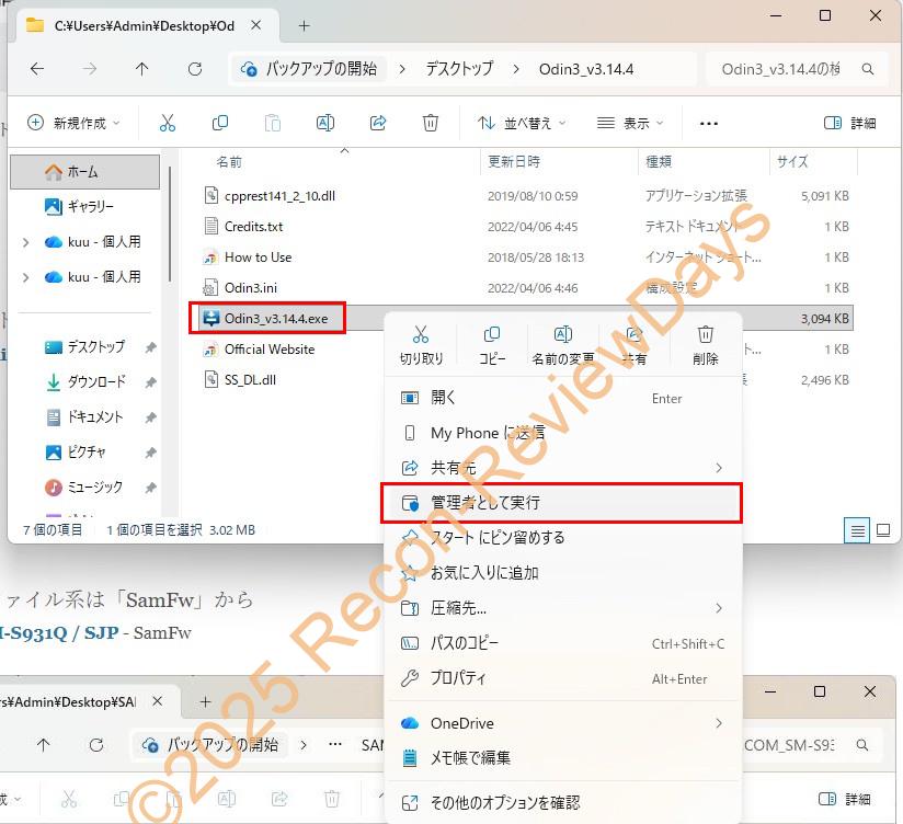 「Odin3_vx.xx.x.exe」を右クリックして「管理者として実行」を行います。