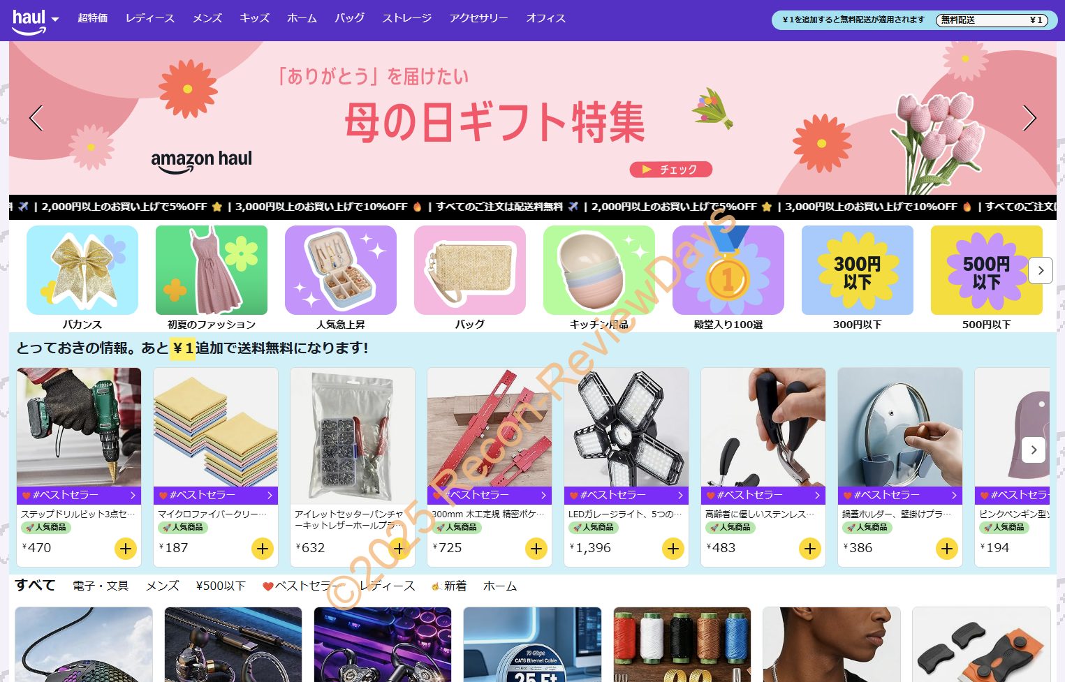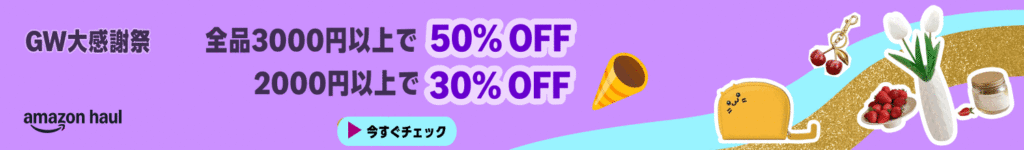 現在「Amazon haul」では「GW大感謝祭」を実施中で「1円以上で無料配送、全品2,000円以上で30%オフ、全品3,000円以上で50%オフ」というセールを実施中。